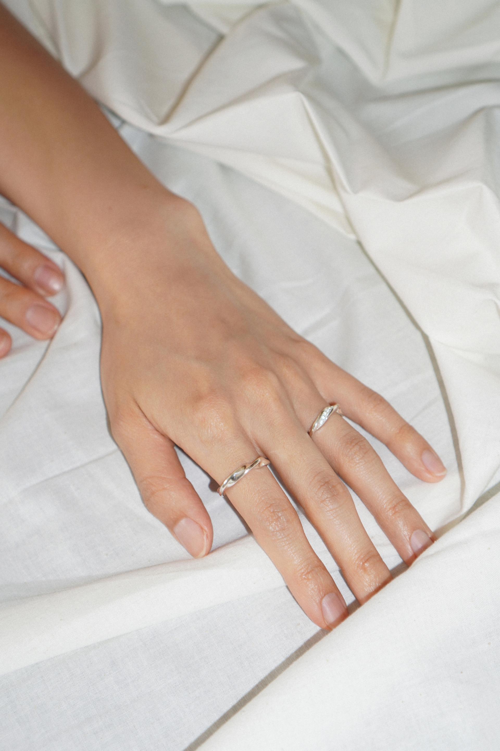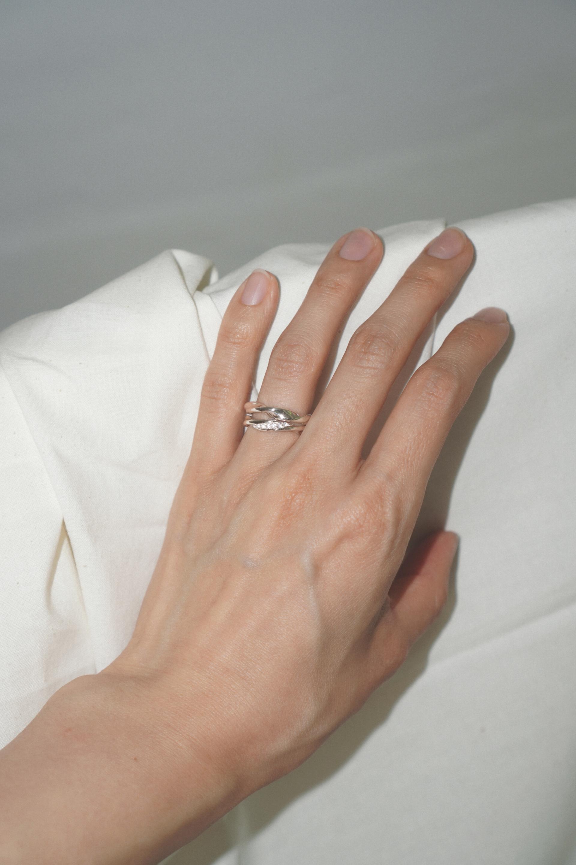 행운을 상징하는 식물 뿌리의 우아한 꼬임 형태를 표현하는 더 루트 링. 고대 아프리카부터 뿌리를 다루는 사람을 뜻하는 '루트 워커' (치유와 행운을 안겨주는 사람)가 존재했을 만큼 그 의미를 중요시했습니다. 스톤 세팅 버전은 중앙에 7개의 화이트 사파이어가 곡선을 따라 섬세하게 파베 세팅되어 은은한 반짝임으로 시선을 사로잡으며, 미러 폴리싱 기법으로 높은 완성도와 함께 고급스럽고 세련된 매력을 동시에 완벽하게 표현합니다. 세팅이 없는 솔리드 버전과 함께 커플 밴드로도 추천드립니다.