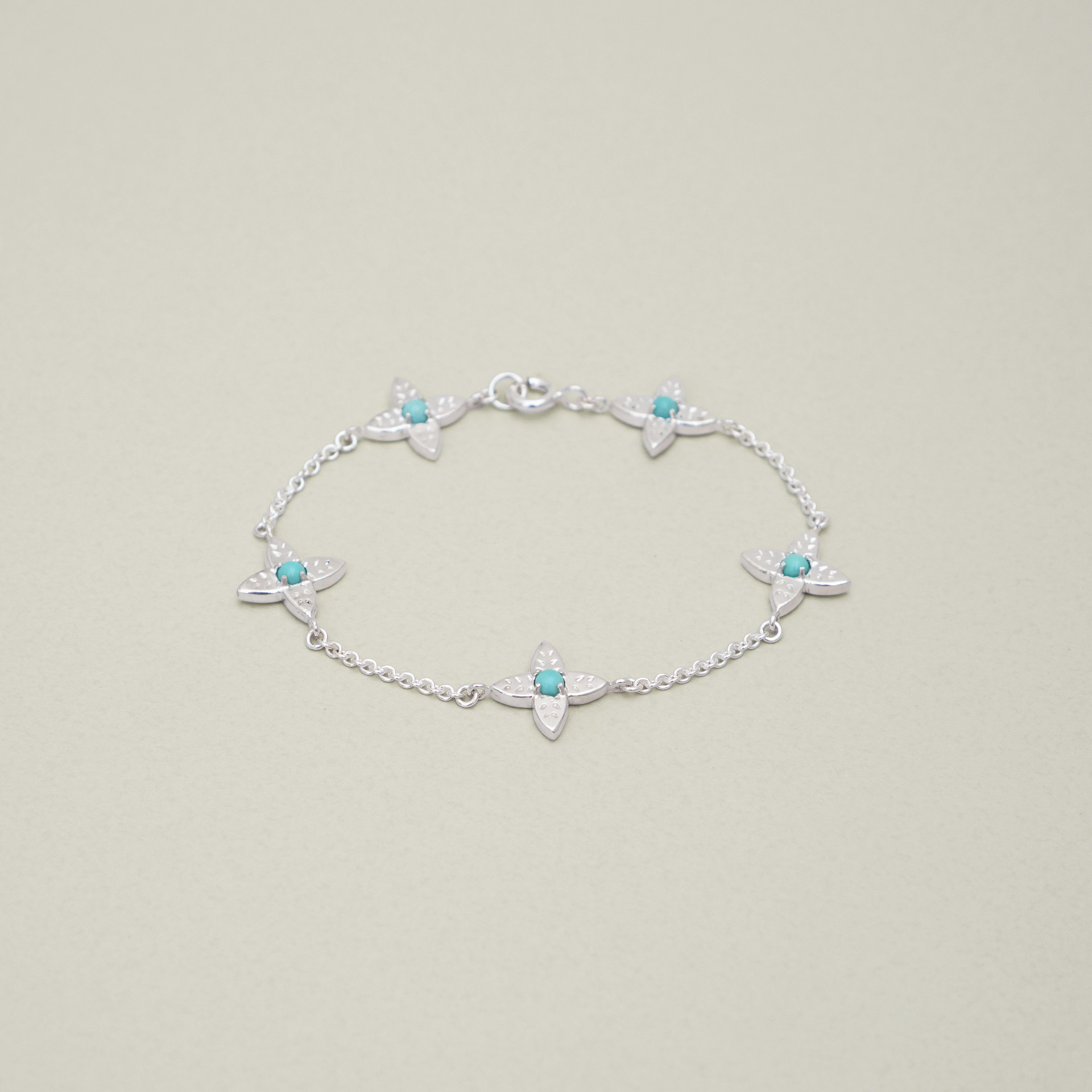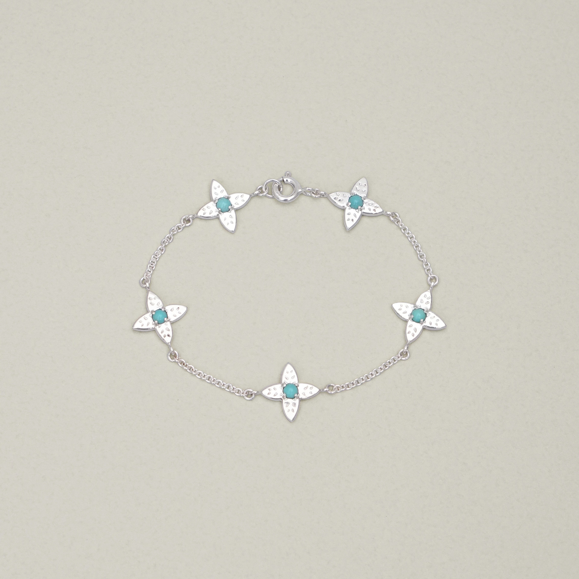 샐비어는 라틴어로 치유, 불멸의 지혜를 의미합니다. 총 5개의 모티브 중앙에 천연 터쿼이즈 스톤이 세팅되어 있으며 청량한 민트 컬러감으로