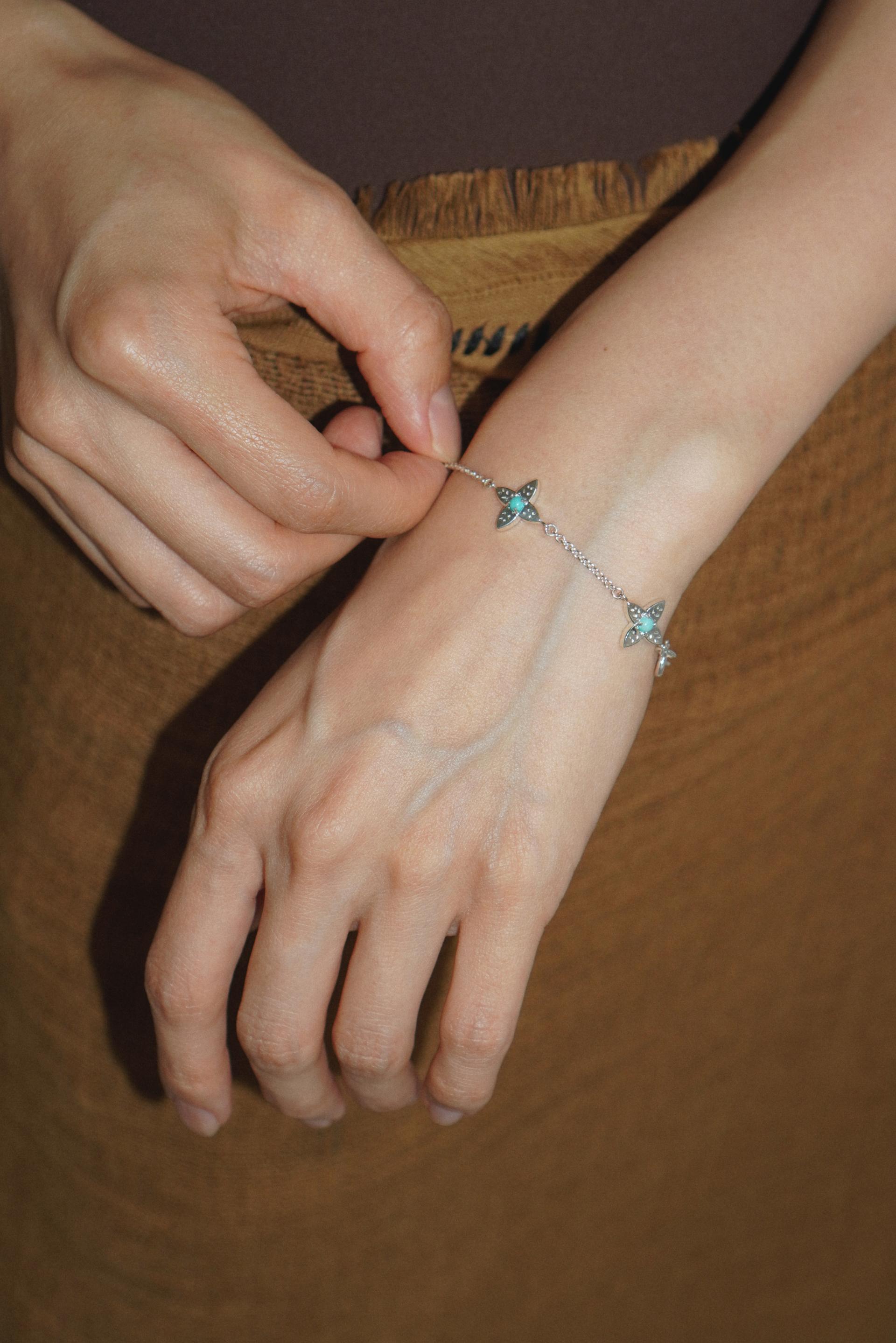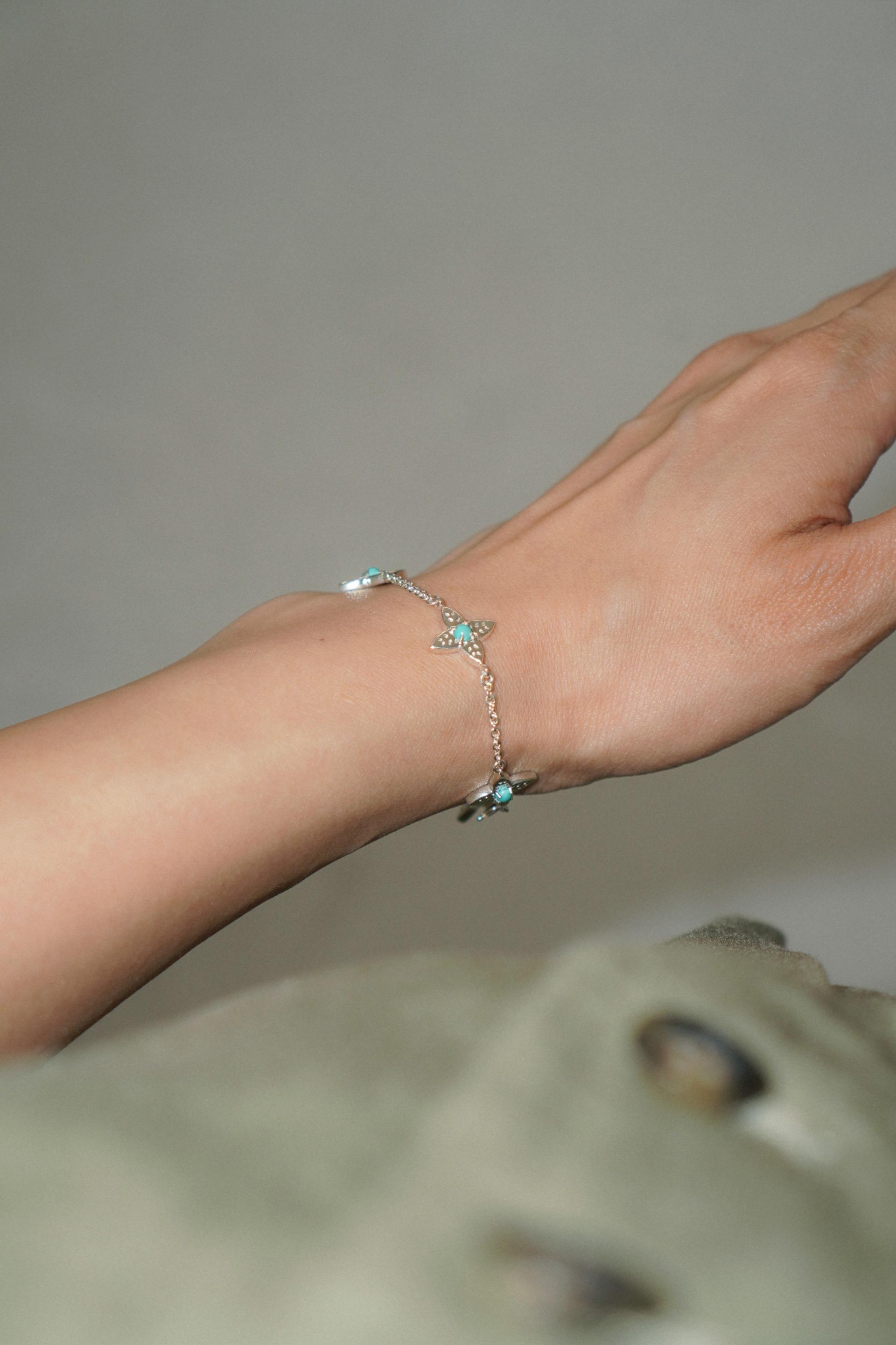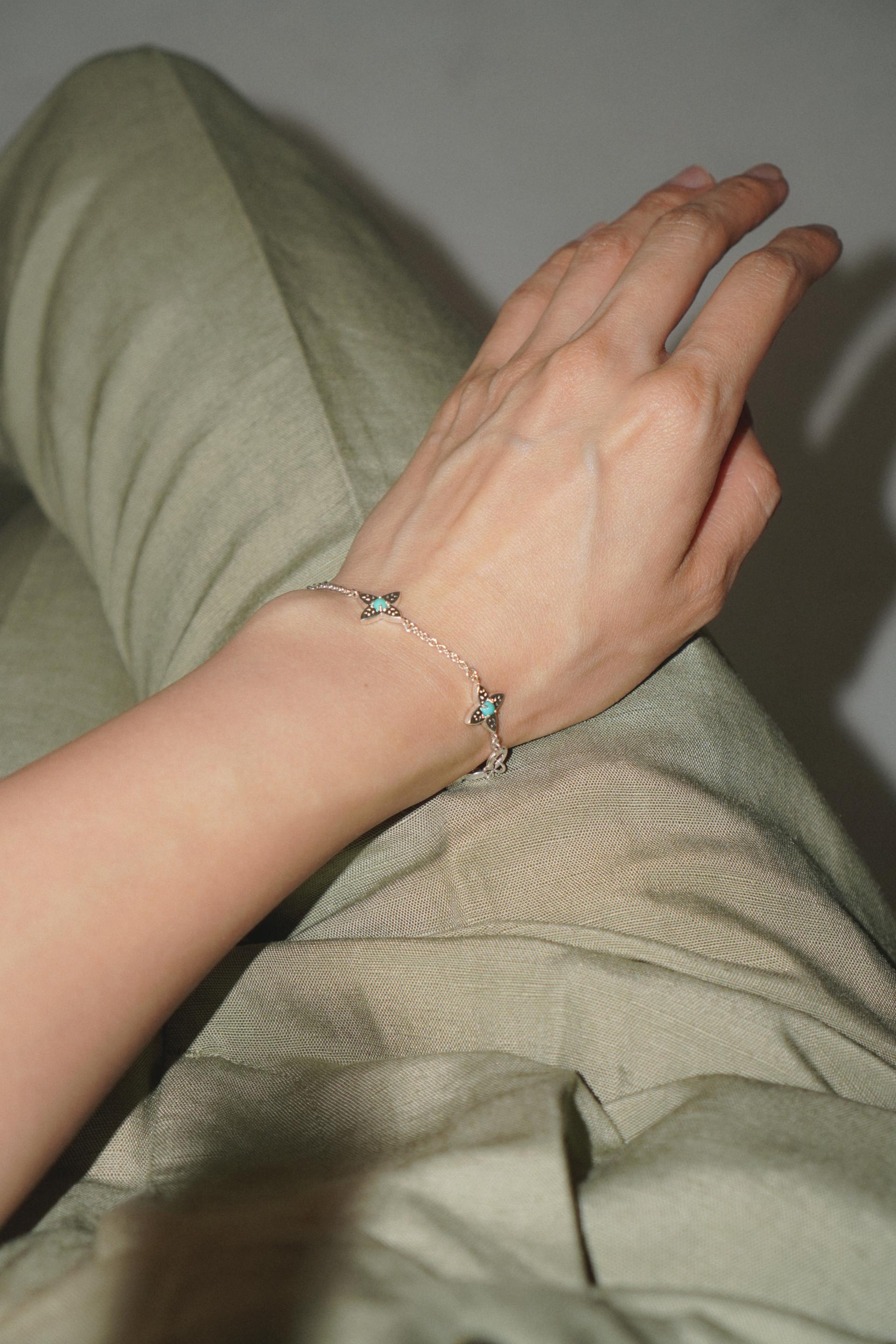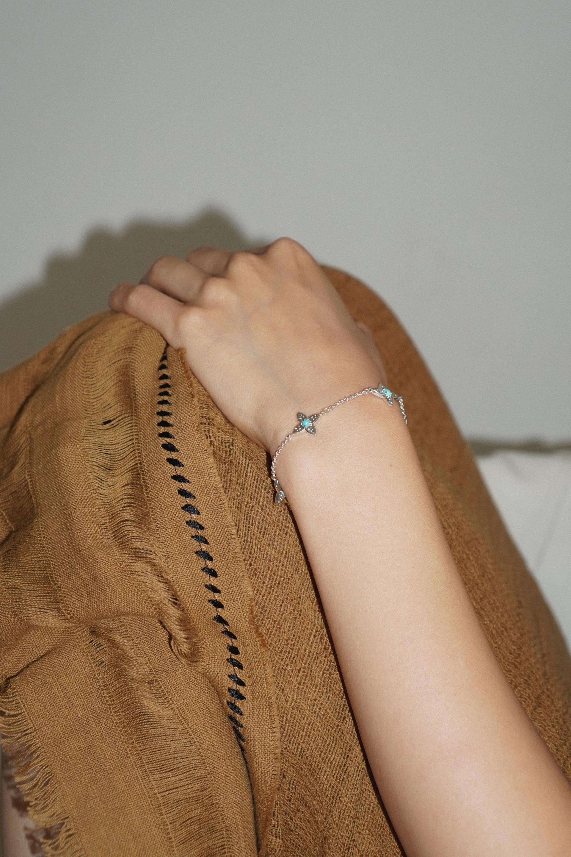 4개의 세이지 잎이 연결되어 하나의 꽃처럼 피어난 샐비어 참 브레이슬릿. 샐비어는 라틴어로 치유, 불멸의 지혜를 의미합니다. 총 5개의 모티브 중앙에 천연 터쿼이즈 스톤이 세팅되어 있으며 청량한 민트 컬러감으로 손목 위로 세련된 포인트를 연출해 줍니다. 뒷면은 매끈한 솔리드 면으로 두 가지 매력을 동시에 느끼실 수 있습니다. 새롭게 태어난 샐비어 허브는 당신에게 매 순간 치유와 긍정을 불러 일으켜줄 거예요. 지금, 그 특별한 아름다움을 경험해 보세요.