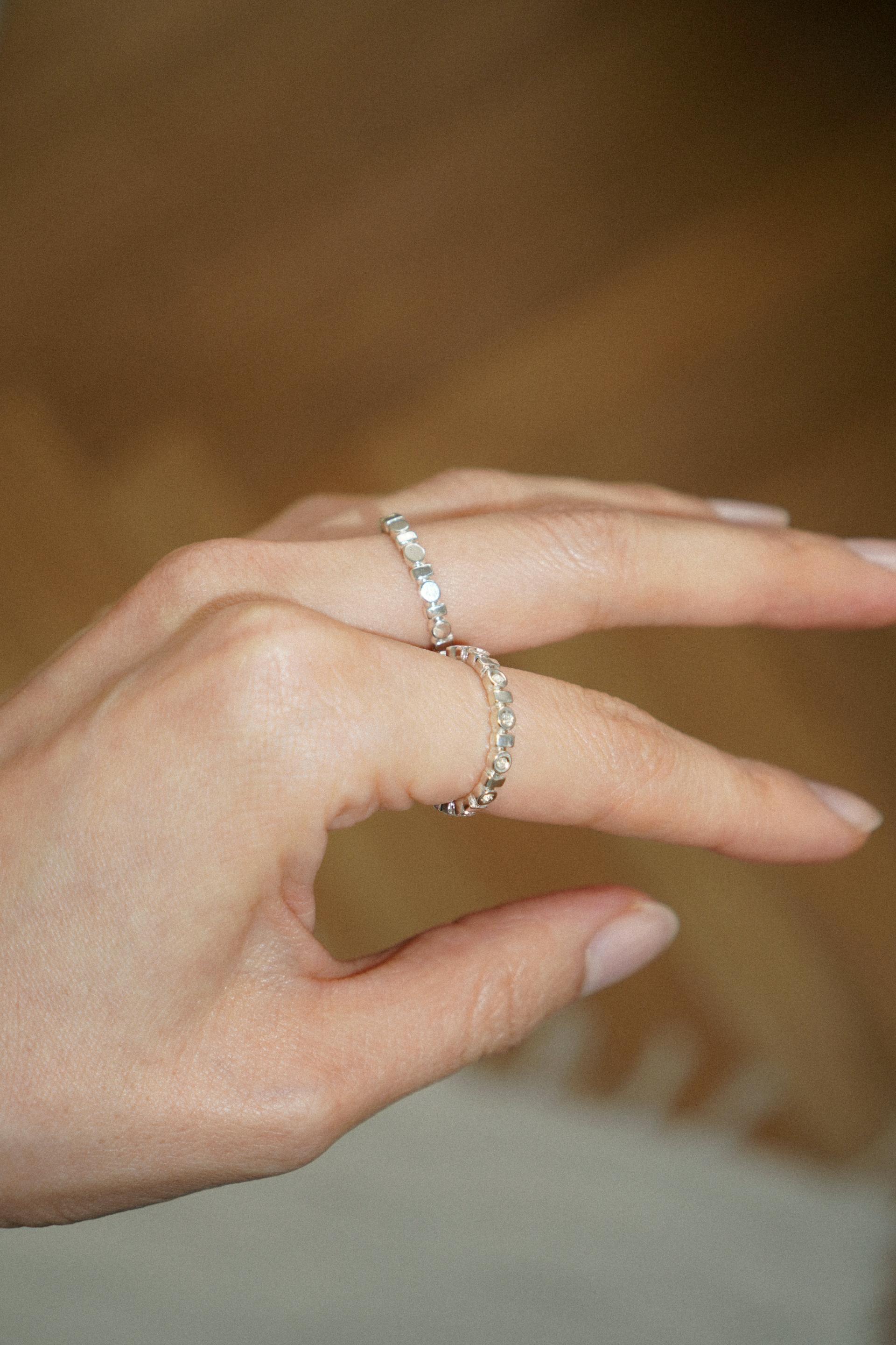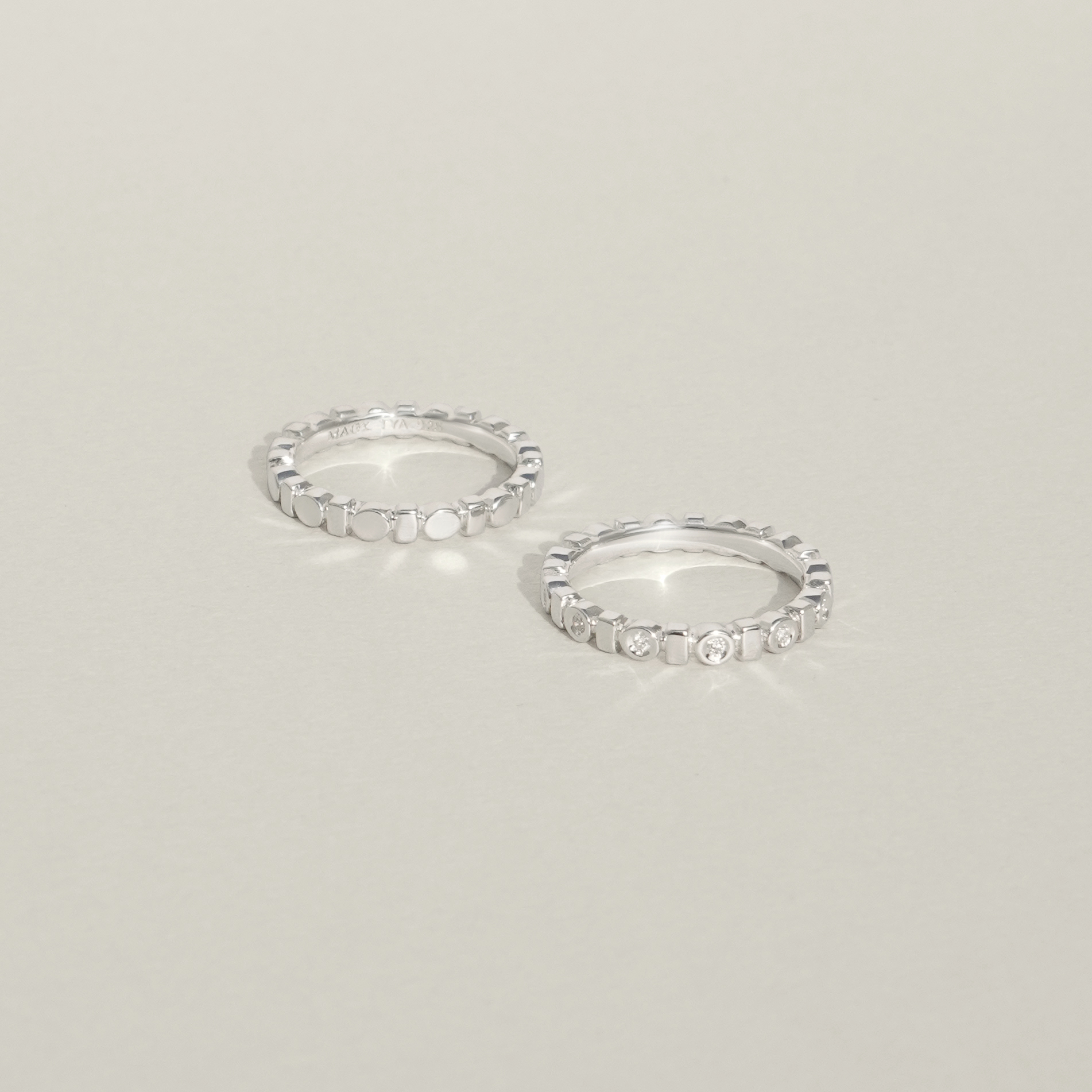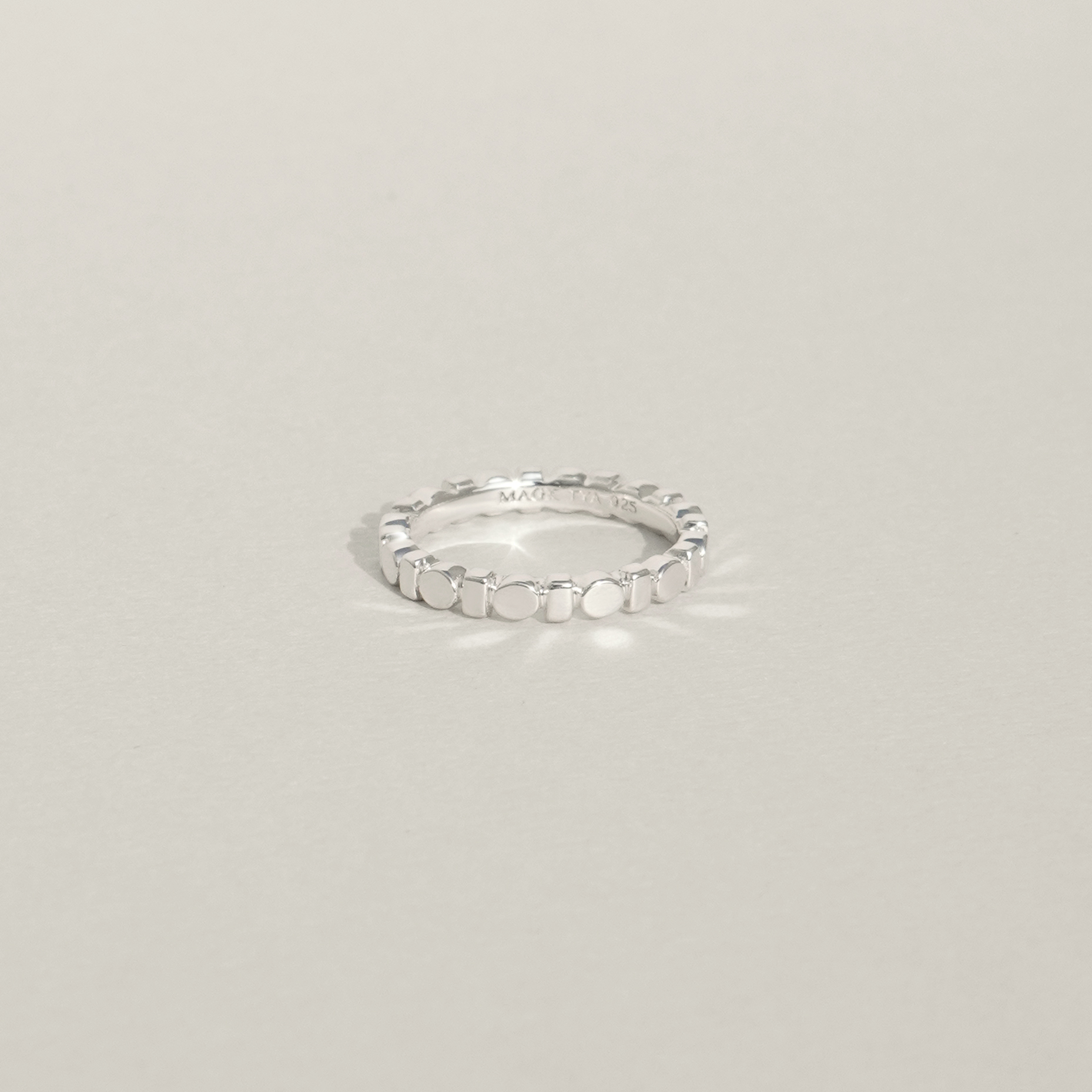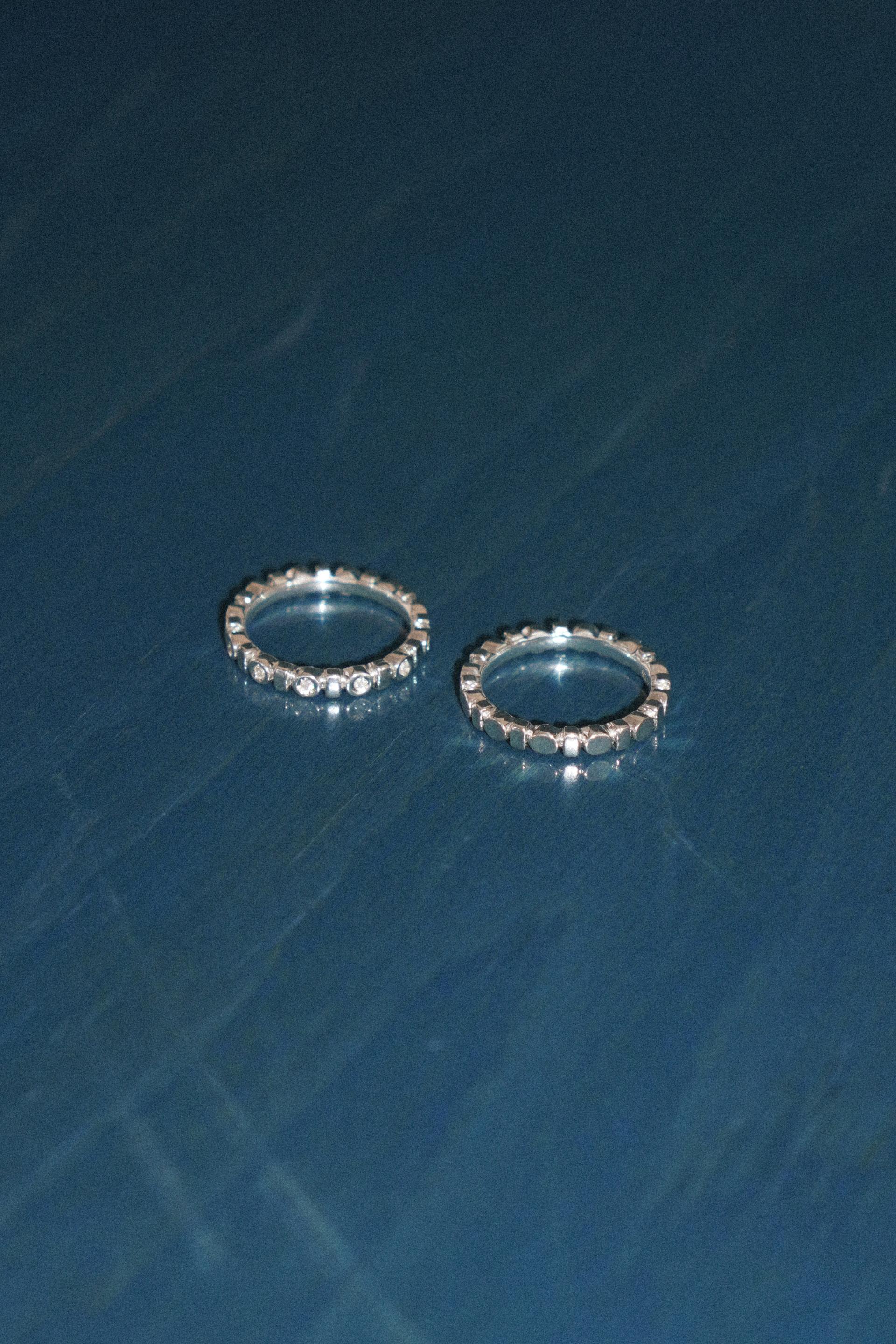 만물의 근원, 의식의 시작점이자 중심을 뜻하는 '빈두(BINDU)'를 상징적으로 표현한 이터니티 링입니다. 기하학 패턴들이 빛에 따라 반사되면서 독특한 반짝임을 자랑합니다. 약 2.6~2.7mm의 넓지 않은 폭이지만 두께감이 어느정도 있어 입체감과 고급스러움이 느껴지는 형태입니다. 2개를 함께 또는 다른 반지와 레이어링하여 더욱 존재감 있는 스타일을 연출할 수 있습니다.