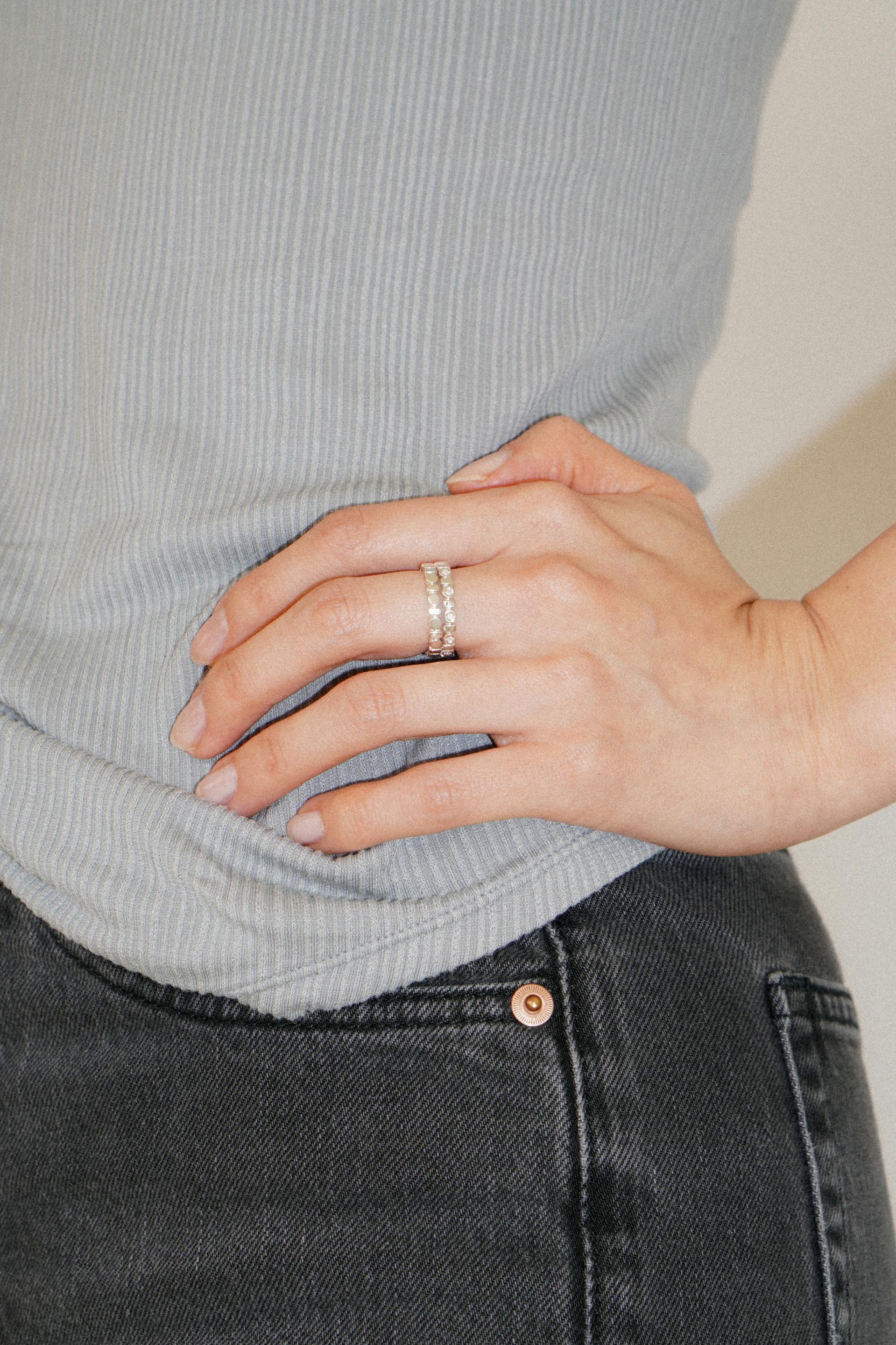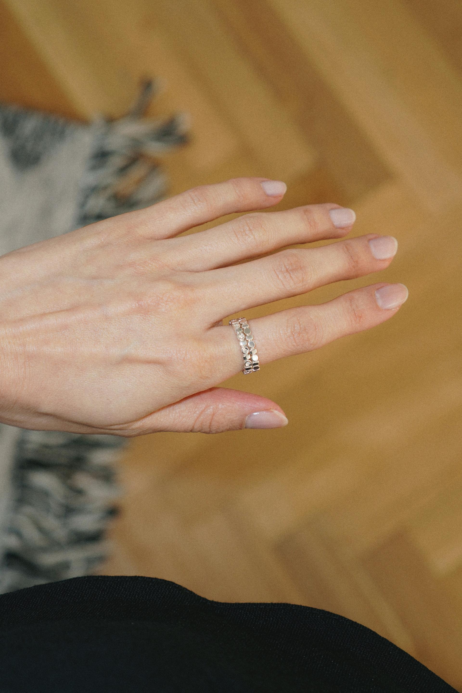 입체감과 고급스러움이 느껴지는 형태입니다. 2개를 함께 또는 다른 반지와 레이어링하여 더욱 존재감 있는 스타일을 연출할 수 있습니다.